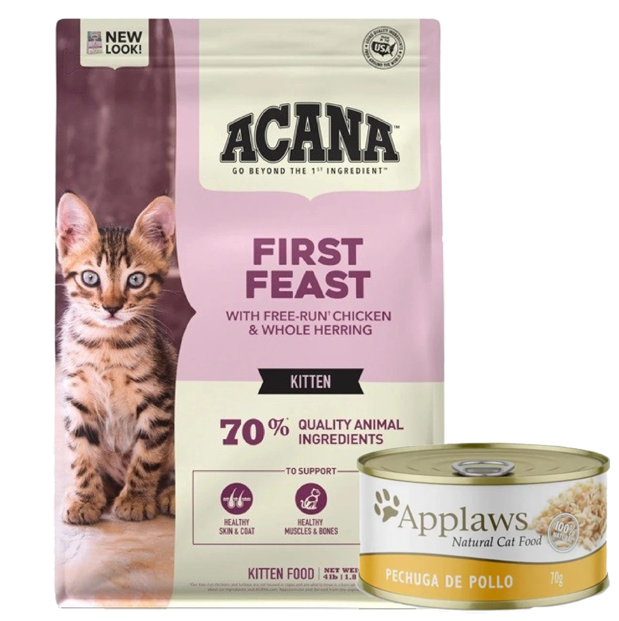 Pon en marcha la vida de tu gatito con un alimento repleto de ingredientes de calidad de origen animal. Elaborado para proporcionar todo lo que tu gatito necesita para un crecimiento y desarrollo óptimos, ACANA™ First Feast está repleto de pollo y arenque entero en proporciones de presa entera de carne, órganos, huesos, que proporcionan a tu gatito todo lo que necesita para crecer sano, feliz y fuerte, y con un delicioso sabor que le encantará.